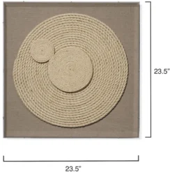 Coastal meets contemporary in this wall art piece formed with layered circles of spiraling rope on a linen backing. The twisted texture of the rope adds further dimension to the spiraling circles as they are layered upon each other; this and the simple shapes and color palette are designed to complement a variety of decor styles. Designed for today’s casual and comfortable home, this wall art is handcrafted out of natural rope and covered with an acrylic shadowbox. Arranged by hand with natural materials, each piece is a unique work of art.