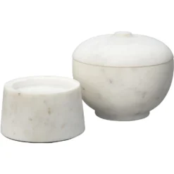 A softly rounded, lidded bowl is placed on top of a pillar base to create some seriously chic storage! These expertly crafted marble containers celebrate the beauty of the natural stone from which they are carved, and no two will be identical. Use with cotton balls in the bath, jewelry in your dressing area, or fill with potpourri to beautify and gently scent your entry.