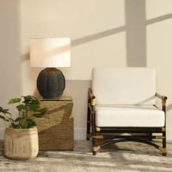 From the Captain collection of home accent furniture. Created with sea and sand and salt in mind, the collection was inspired by Jaime’s travels to coastal paradises across the globe. Each piece is artisan crafted from sustainably harvested seagrass and topped with a strong slab of tempered glass. The intrinsic beauty of the natural material is allowed to take center stage, and flaws in the organic material are not only celebrated but considered an integral part of the design.