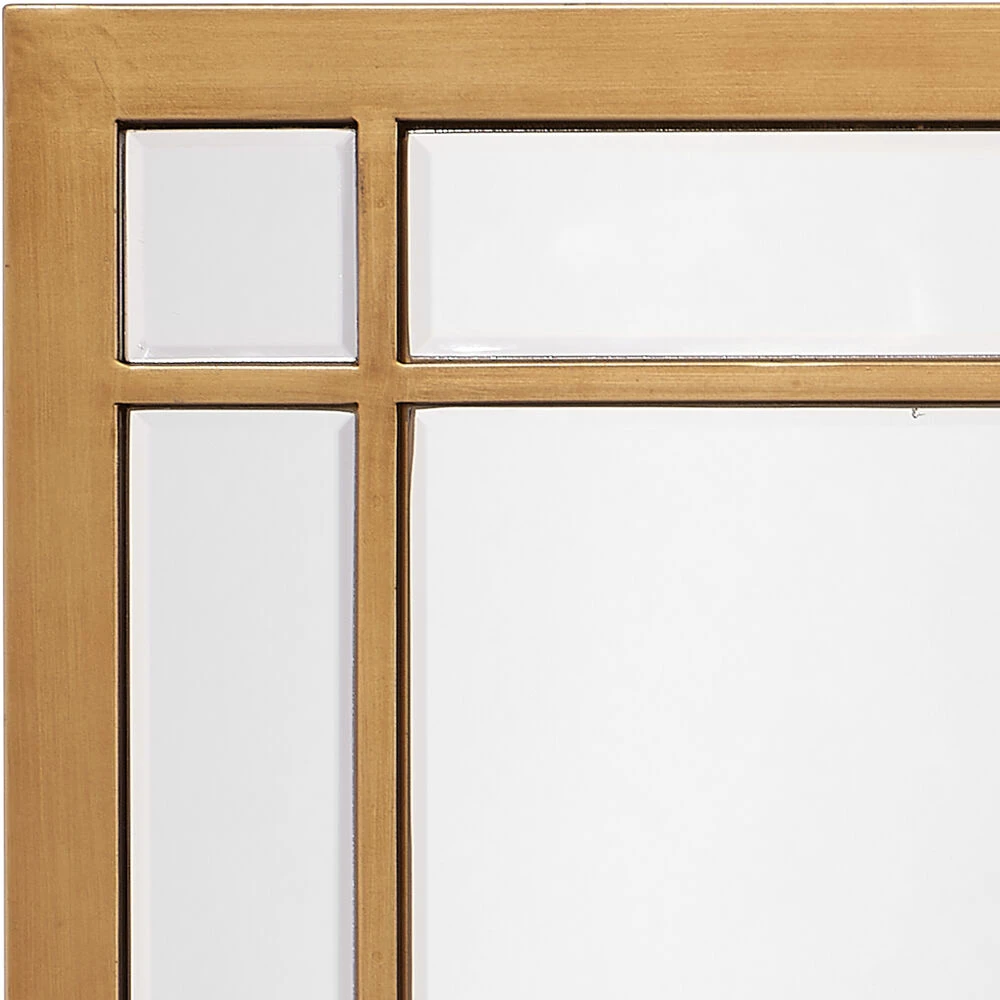 Framed in geometric cutouts, this mirror makes an elegant statement in your entryway, bedroom or living space. Featuring beveled glass surrounded by a slim metal frame hand-finished in antique brass making this suitable for urban and modern settings.