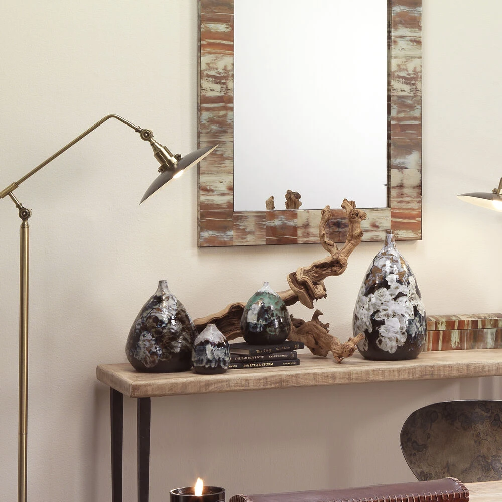 The stunning Collage collection features artisan crafted ceramic vases. They are available in an assortment of sizes and shapes, and each features thick, rich layers of hand applied glaze. The colors are organic and inspired by the earth. Every shade of sand, stone, sea, and sky can be found. True one-of-a-kind works of art, they are beautiful on their own or with your choice of dry filler, try feathers or reeds! Due to the handmade nature of this piece, variations in finish, pattern & shape will occur. No two will be alike.