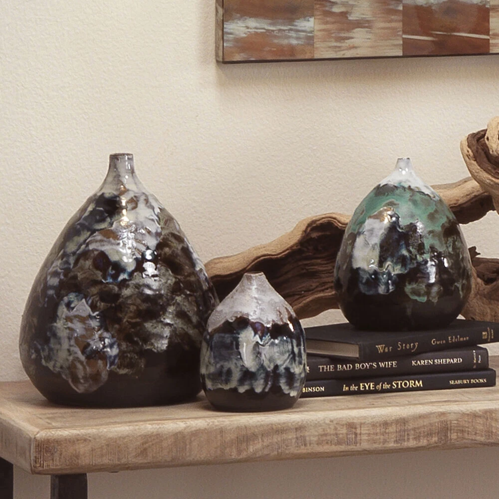 The stunning Collage collection features artisan crafted ceramic vases. They are available in an assortment of sizes and shapes, and each features thick, rich layers of hand applied glaze. The colors are organic and inspired by the earth. Every shade of sand, stone, sea, and sky can be found. True one-of-a-kind works of art, they are beautiful on their own or with your choice of dry filler, try feathers or reeds! Due to the handmade nature of this piece, variations in finish, pattern & shape will occur. No two will be alike.