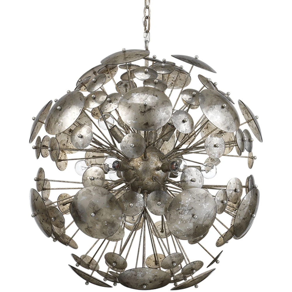 The Constellation Round Chandelier makes a bold modern statement with antiqued glass and champagne leaf metal. Inspired by the mid-century Sputnik chandelier, this hanging fixture provides beautiful ambient light glittering through layers of glass with speckled metallic patterns.