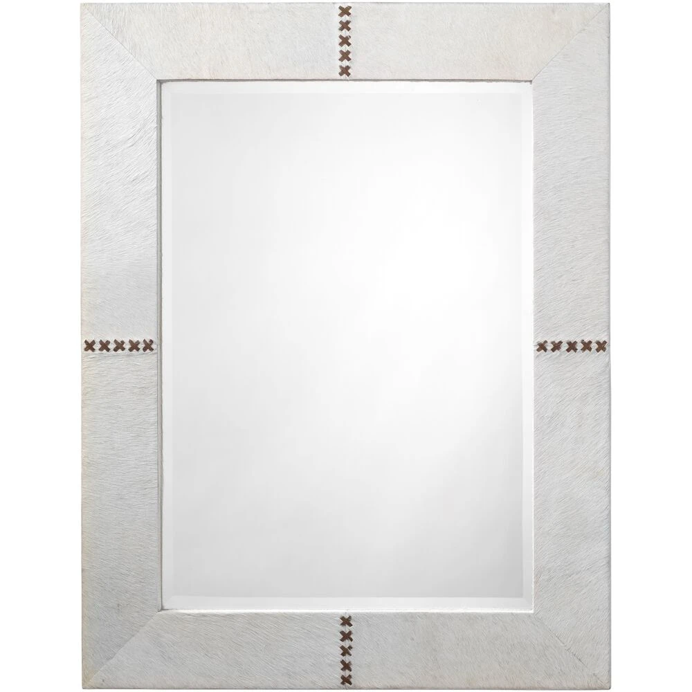 This generously sized beveled wall mirror is edged in hair-on-hide and accented with a contrasting leather cross stich. Available in white or grey, the mirror can be hung horizontally or vertically to suit any decor. Our hides are hand-selected for quality, and small variances in shading may occur. Natural color variation will occur in hide.