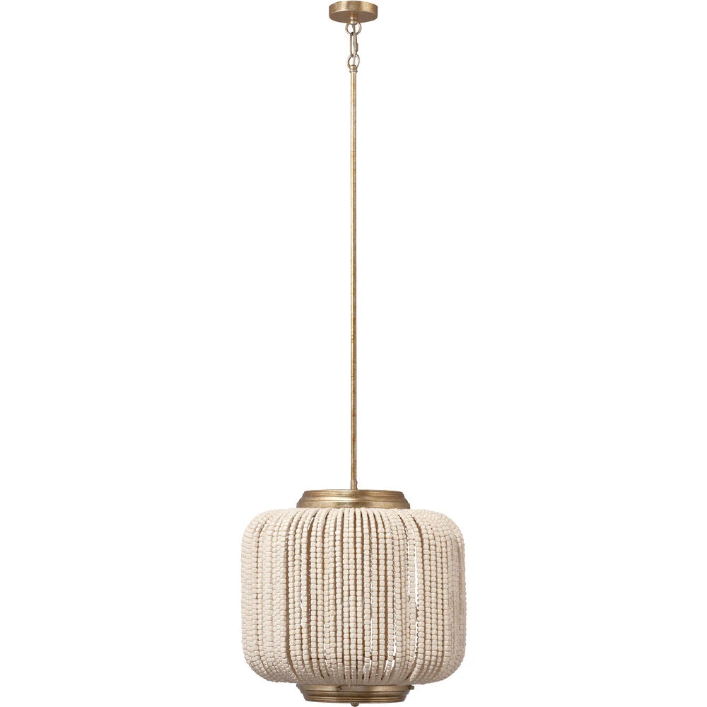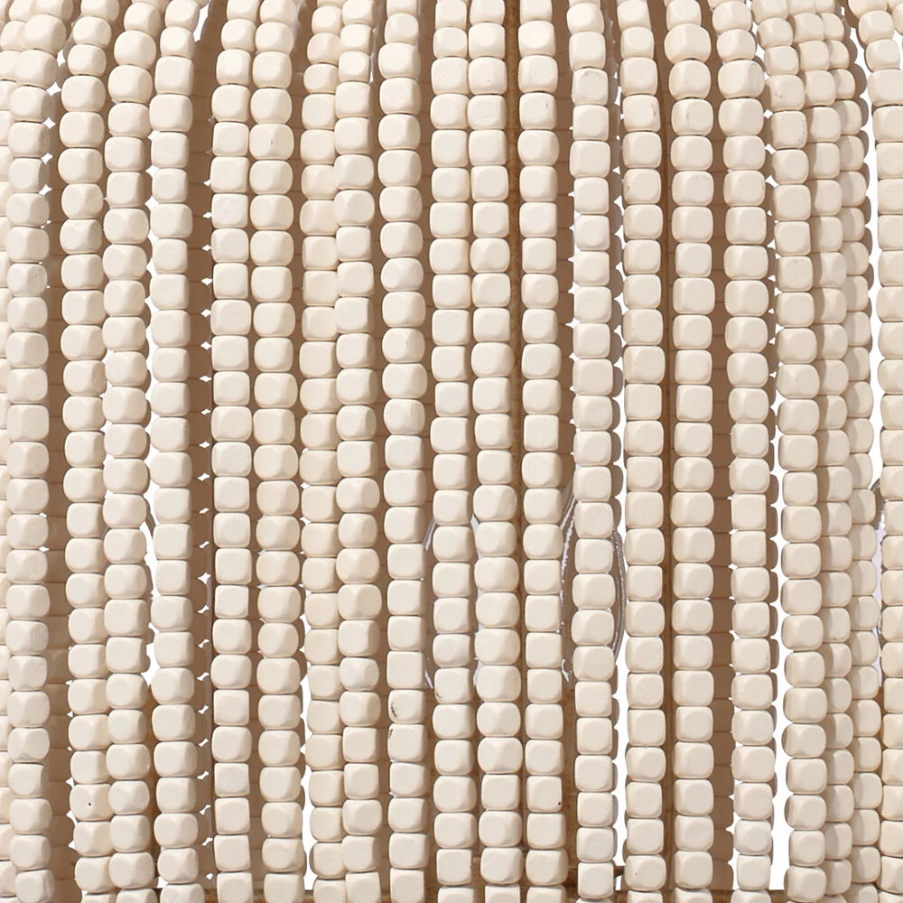 Cascading strands of carved wood beads flow gracefully and abundantly to create the “shade” in this astonishingly lovely chandelier. The antique white beads create a vibrant, effervescent curtain that softly diffuses the light. As the beads are carved from natural wood, the finish and striations on each will vary slightly. The frame and metal accents are iron with a richly contrasting antique silver finish. A unique blend of vintage and modern, this intriguing piece was designed to be easily integrated into a multitude of décor styles. The fixture is suspended from a 5′ max. adjustable antique silver rod, and professional installation is recommended.