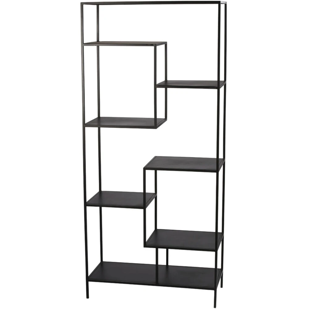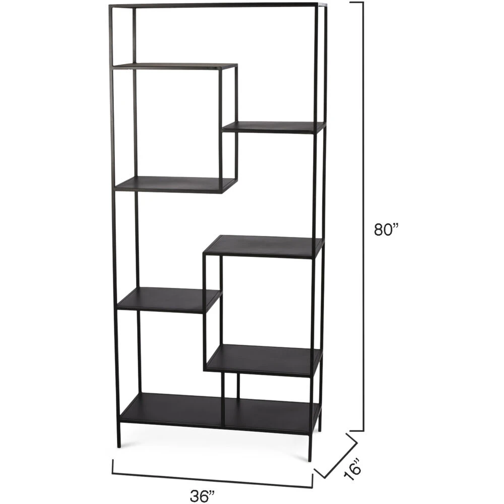 Black metal shelves and supports are asymmetrically arranged to create the perfect open-work etagere. Finished on all sides, this piece makes a great room divider. Use two of these shelving units side-by-side to create a larger piece that is the perfect reflection of itself and twice as large!
