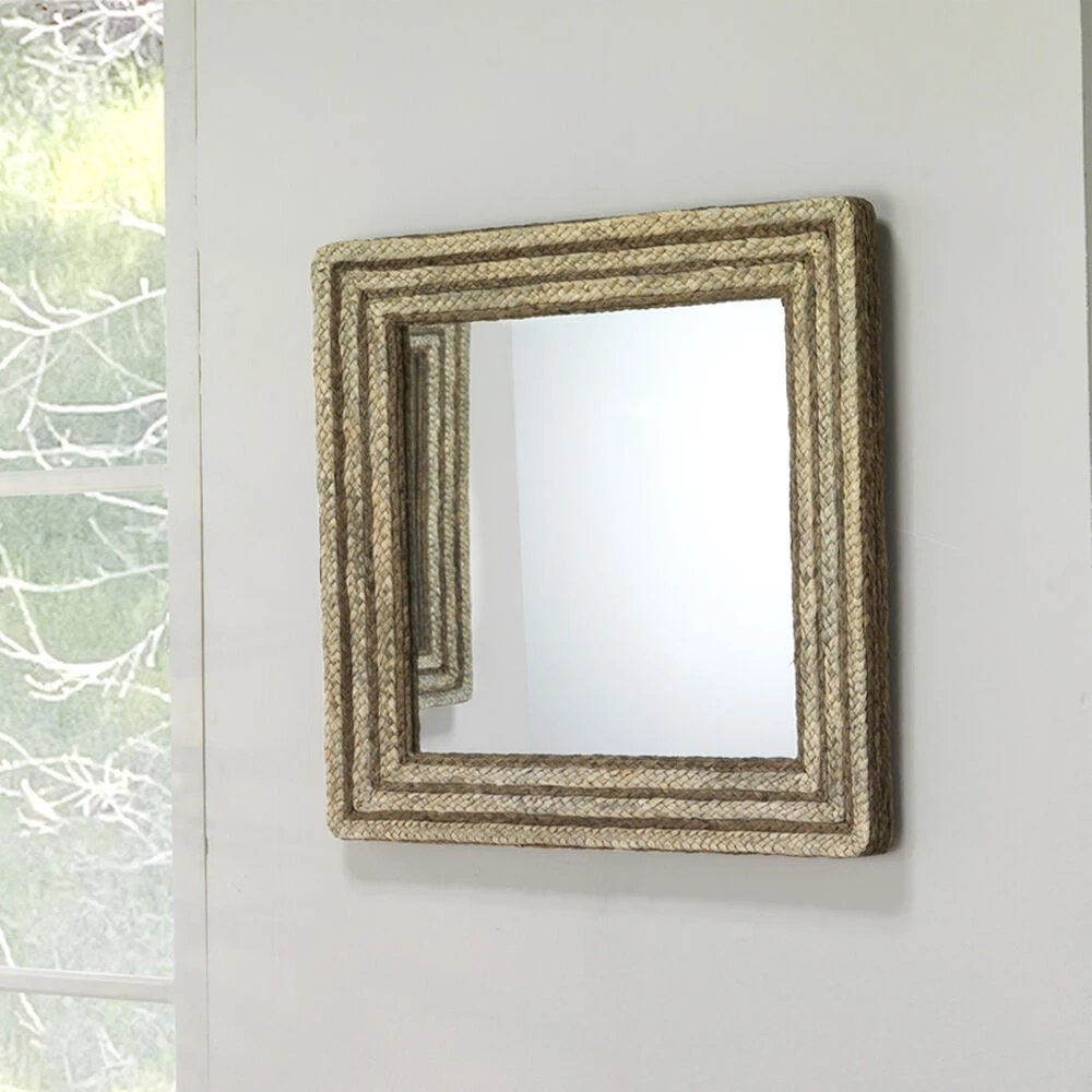 Braided seagrass wraps around the Evergreen Mirror’s square frame to highlight it’s geometric shape. The woven frame gently recesses towards the glass to add depth and dimension to this otherwise naturally, simple mirror.