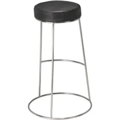These unique stools are available in bar or counter height. Each features a comfortably padded round seat in top-quality matte charcoal leather that tops an asymmetrical tri-legged base in a modern metallic finish. The contrast between the sleek, slim pewter base and the substantial seat is elegant and unexpected, and results in the perfect perch for home bar or kitchen counter!