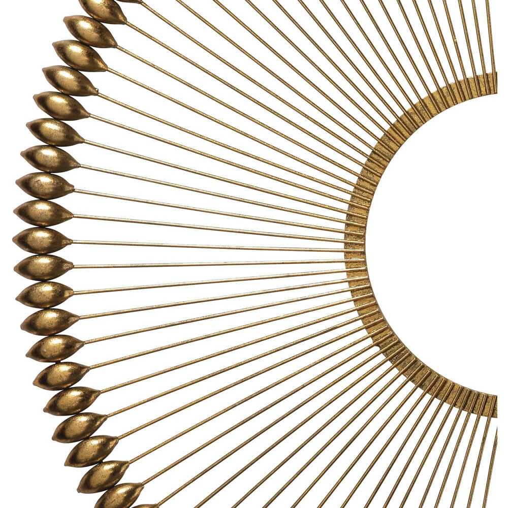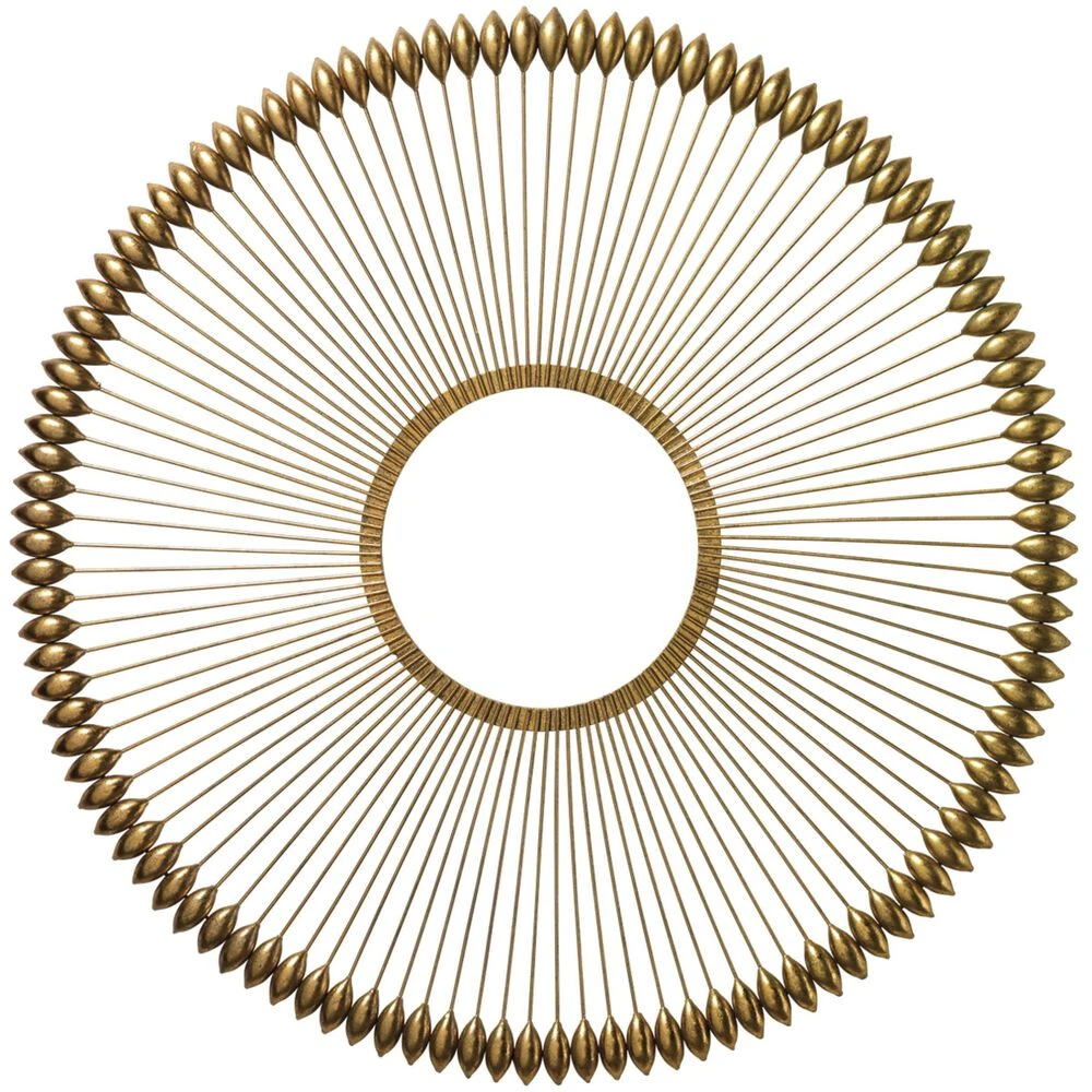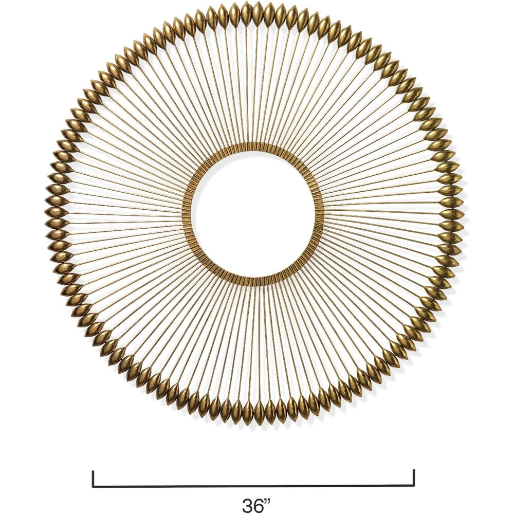 The Illume wall art piece adds great texture to all walls. Its repetitious pattern of bold gold lines ending in soft teardrop shaped gold orbs creates quite a statement. With a nod to midcentury design, this updated wall art piece will stand the test of time. Hanging hardware: keyhole hanger. Center opening: 10.5″dia. Metal Type: Iron
