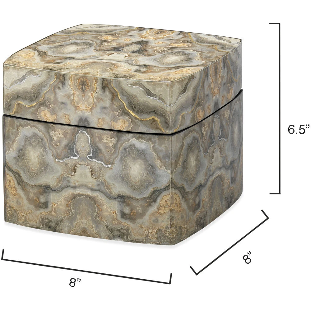 Inspired by Rorschach inkblots tests, known to examine emotion through interpretation, our Ink Blot box inspires you to look closer into the neutral tones of grey, taupe and cream, accented with silver and gold leaf. These components create dynamic patterns through overlaid photos underneath a clear lacquer.