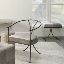The Kai collection features dynamically swooped hand-forged iron legs, with a delicacy unexpected from such a substantial material. The seating is topped with thick cushions of grey hair-on-hide, and the tables with strong tempered glass. Unexpectedly combining grace and strength, they make a striking addition an industrial, rustic, or eclectic home.