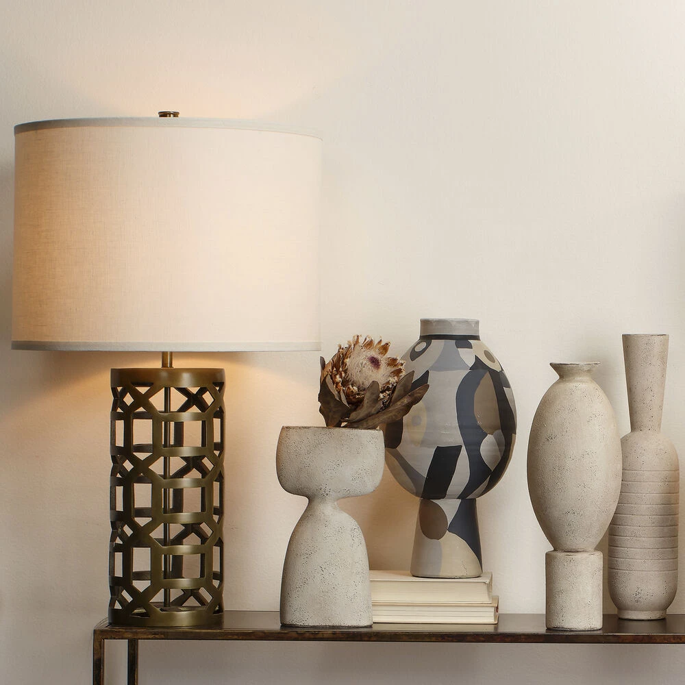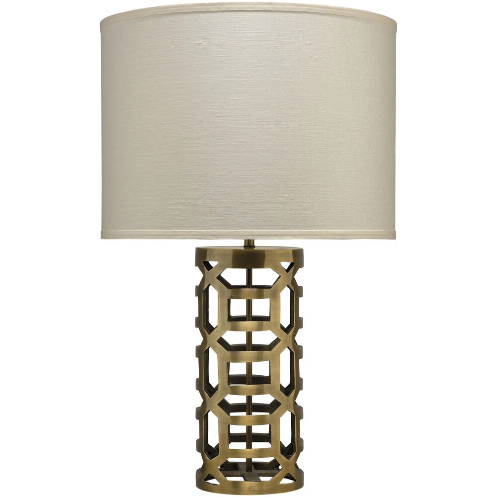 The maze of rich antique brass creates a stunning pattern of metalwork in the Labyrinth Table Lamp. The hollow core allows any backdrop to peek through the design and be incorporated into the lamp, nicely balancing the bold design with any environment. Metal Type: Aluminum.