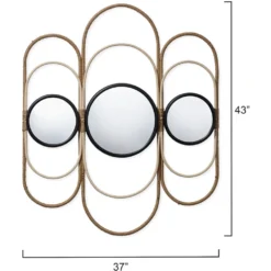 Three black-framed round mirrors are accented by oblong oval shapes wrapped in natural and light-colored jute rope to create this contemporary mirrored art piece. The bold layers, shapes, and textures are truly hypnotizing, pairing both natural and industrial elements. Create a focal point in your home with this eye-catching decorative mirror.