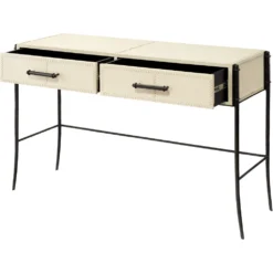 Off-white leather contrasts boldly with hand-forged iron in the artisan-crafted Nevado Console Table. Featuring two drawers that open smoothly for storage with iron pulls, elegantly sabered legs, and visible stitching for a touch of unexpected drama. Contemporary, with an Asian inspired edge and a subtle nod to Western style, this console table is perfect to display and store everything from your favorite lamp, candles or photos of your friends and family.