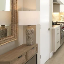 The bold glaze takes center stage in the Nomad Table Lamp! Neutral creams and browns wrap around this stunning ceramic table lamp and finial to maximize style. The lamp base’s cream tones are matched with an off-white linen lamp shade to create the perfect pairing.