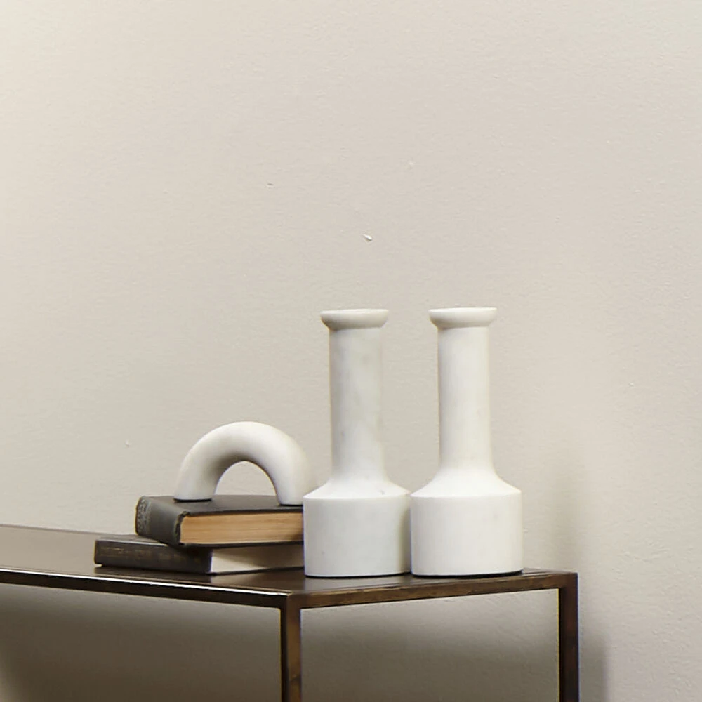 These artisan-crafted marble objects celebrate the beauty of the natural stone from which they are carved. The simplicity of their lines allows the white marble to shine, highlighting and honoring its intrinsic veining, colors, and patterns, and ensuring that no two will be identical. While their original inspiration was London’s Marble Arch, the design didn’t coalesce until Jaime stripped it of its rigid architectural beginnings and added a soft organic quality, resulting in the lovely, graceful piece you see here.