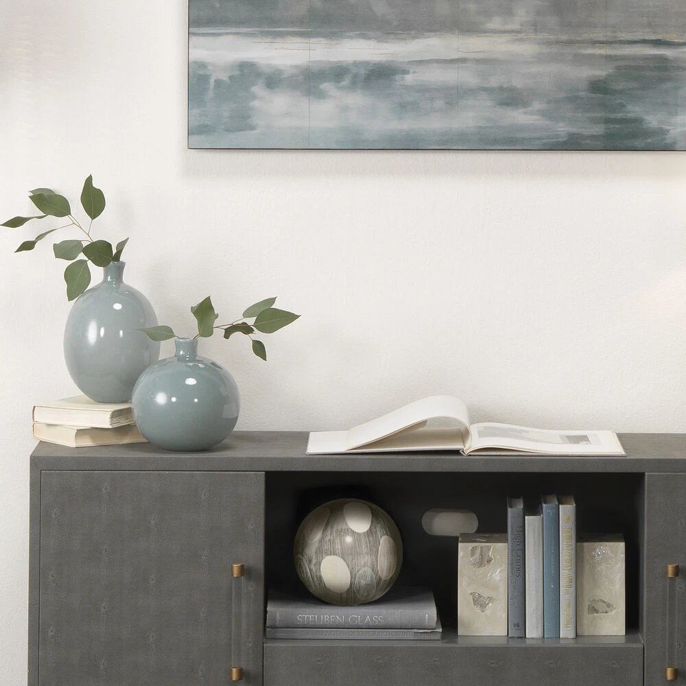 These mesmerizing ceramic orbs are hand finished in an organic pattern of cream, blue, black, and white. Inspired by the play of light and shadow on the cobblestone alleys of Europe, they add an undeniable sense of sophistication to any home. Place alone or in pairs on a console, bookcase or side table for a look of organic refinement.