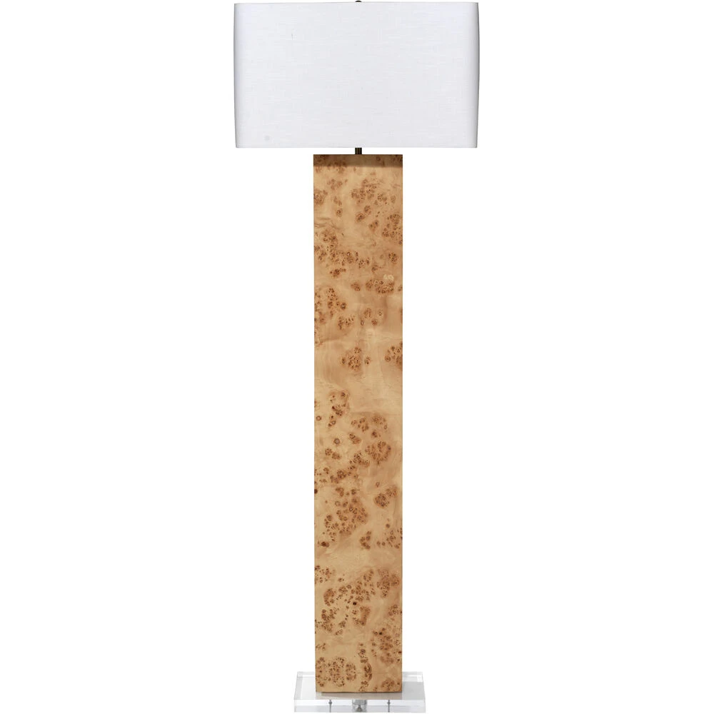 Magically melding natural burl wood with modern materials, this evocative table lamp manages to be both modern and timeless. From top to bottom: a square cylinder acrylic finial, a white linen rectangle shade with softly rounded corners, and a burnished base that embraces the beauty of the natural wood. It all rests upon a rectangle of clear acrylic.