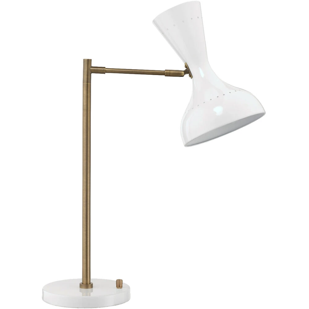 This mid century inspired task lamp has an hourglass hood with two directional sockets. One upward socket and one downward within the swivel hood make it easy to direct light for a great working environment. The high lacquer finish on the hood and base in white metal contrast the antique brass body creating a classic, modern and contemporary look to go on any desk.