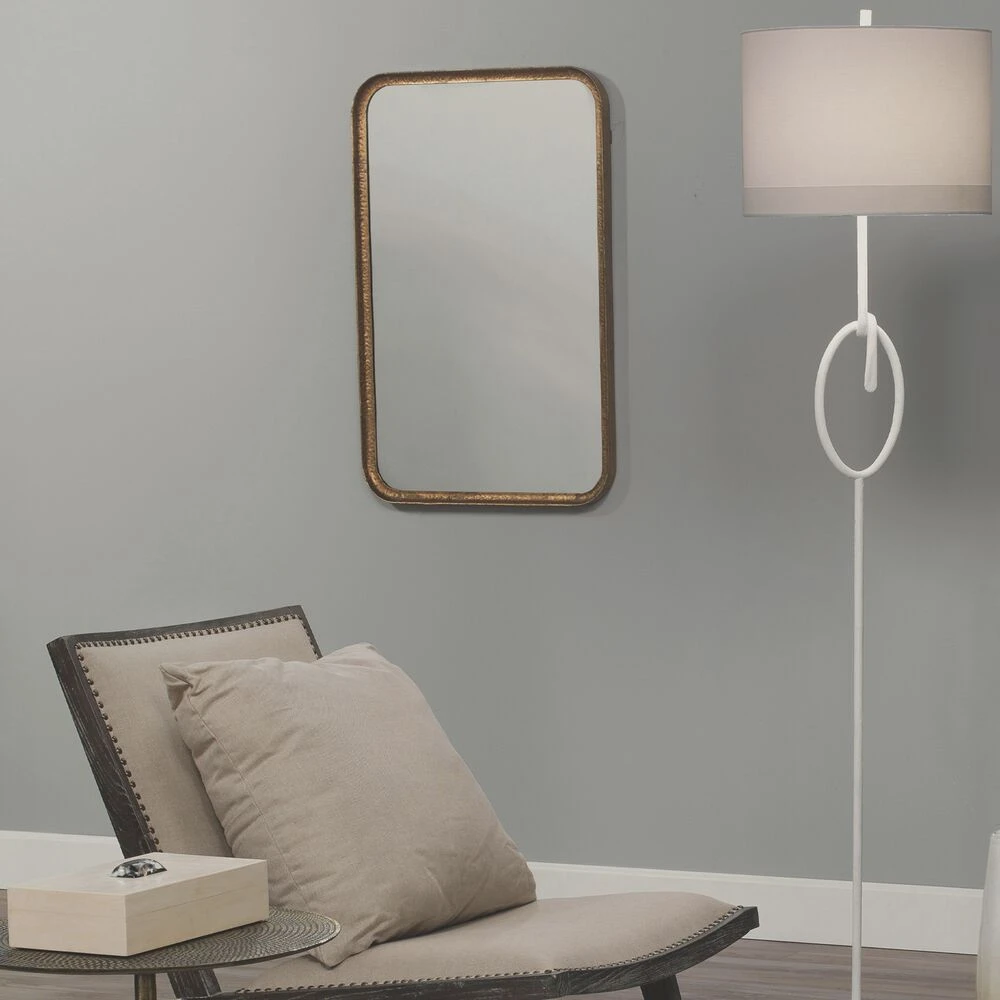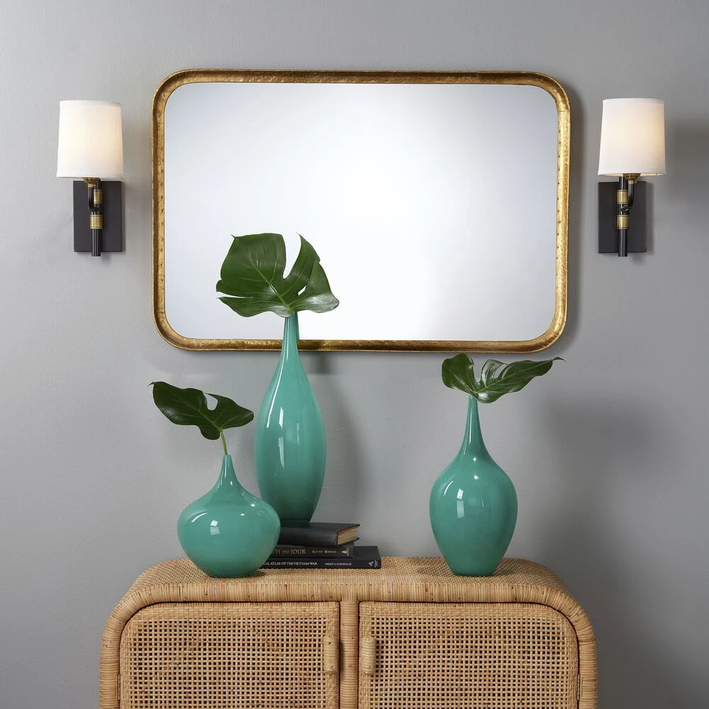 This rounded edge rectangular mirror has a narrow curved frame in gold leaf, making it a perfect combination of bold glamour and subtle refinement.