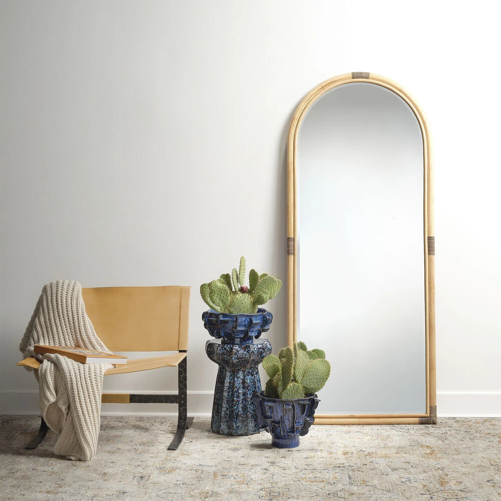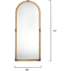 This gently arched, full length floor mirror’s natural rattan frame is subtly embellished with decorative notes in gray rattan wrap. It’s beveled mirror, finished back, and striking craftsmanship elevate a simple design into something extraordinary. Lean against the wall in your living area or bedroom; it will open up the room and let you grab a last-minute look at your outfit before you head out into the world.