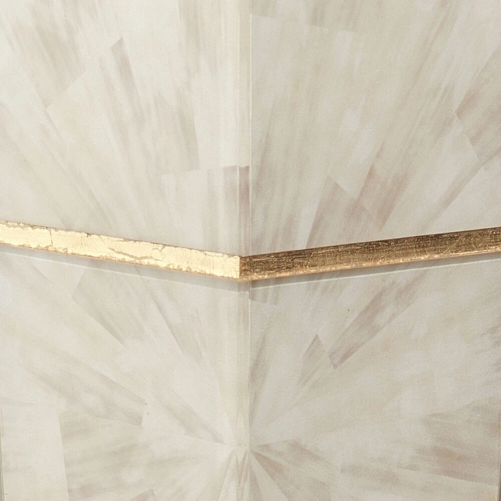 With all the spectacular beauty of natural burnished horn but none of the cruelty, the bases of these lamps dazzle. The horn inspired patterns are expertly artisan created from layers of soft gray lacquer and then accented with rings of genuine gold leaf. A tapered shade in creamy white linen and a cubed cylinder finial in more rich gold leaf are included.