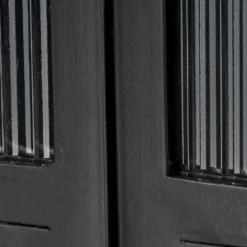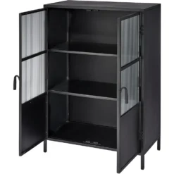 With an abundance of storage and tons of style, this industrial edged dresser is ideal for an urban, contemporary décor. Handcrafted of minimally finished black metal, its two large doors open to reveal ample cupboard space and two fixed shelfs. The simplicity of the design is elevated by panels of richly textural ribbed glass and hand-forged iron pulls.
